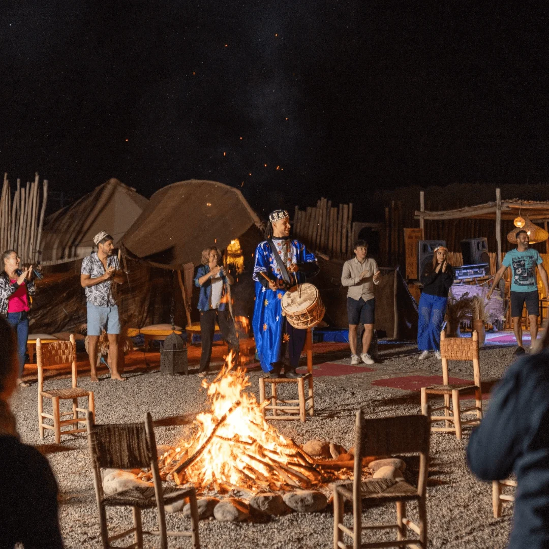 Feast on a 3-course traditional Moroccan meal by candlelight, with live Gnawa music and desert performances creating an enchanting atmosphere. After dinner, gather around the campfire for stargazing, storytelling, and a final cup of tea before returning to Marrakech.